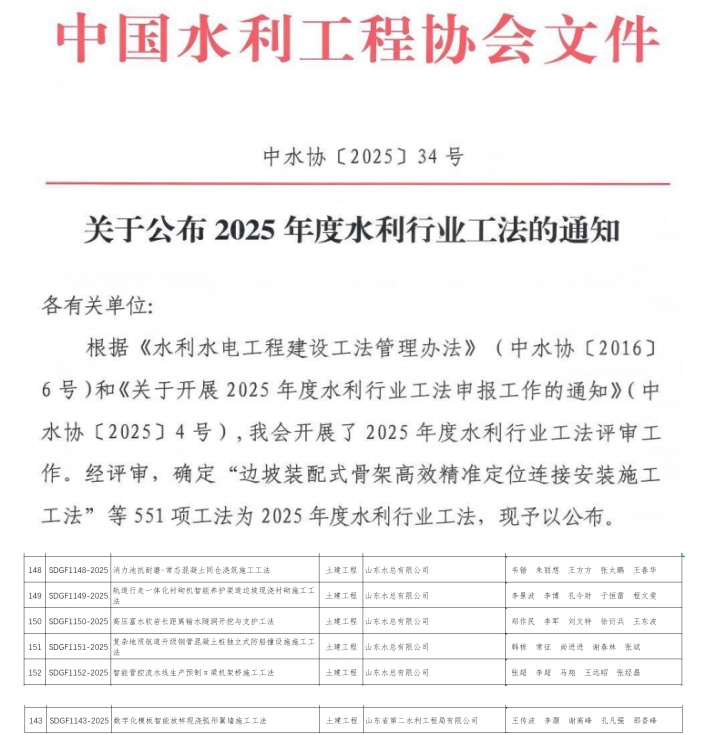 近日,中国水利工程协会正式公布2025年度水利行业工法评审结果,万搏体育凭借在水利工程施工技术领域的持续创新与实践积累,共有6项工法成功获评,关键技术均达到国内先进水平。